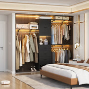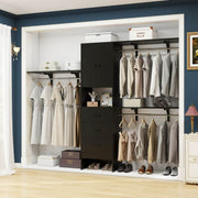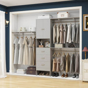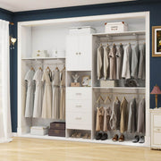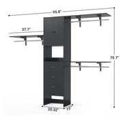 All-in-one Multifunction Closet Rack: This 96'' wood closet organizer set comes with 3 shelf towers, 3 expandable rods, 3 big storage drawers, and 3 interior shelves (height adjustable). It is a perfect home organization system for closet spaces to store shirts, pants, jackets, sweaters, shoes, decor, or other items.