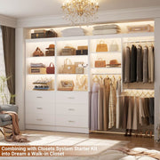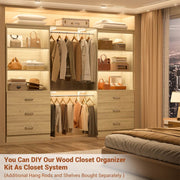 Wood Closet System with 6 Drawers: With 6 wooden drawers which are durable, unlike other’s fabric drawers that are easily damaged and difficult to clean.Perfect for stashing your personal belongings, underwear or socks.The drawers can also stack some T-shirts. The metal drawer handles are more exquisite. The drawers are easy to open with smooth sliders.