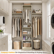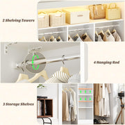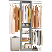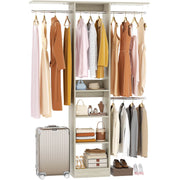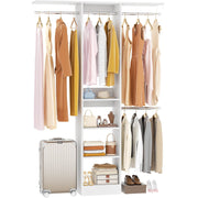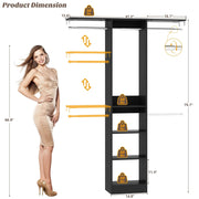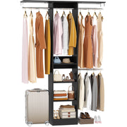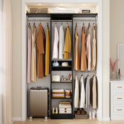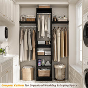 Maximize Vertical Space: 80" tall narrow closet organizer with 4 adjustable rods and 2 shelf towers, storage boxes can be placed on top of the shelf towers, and the top rods can hang dresses, coats, bottom rods hang pants, T-shirts, storing 150+ items while keeping floor space clear.
