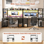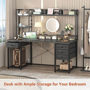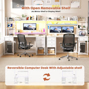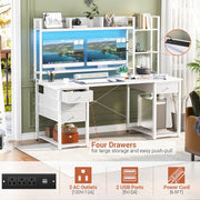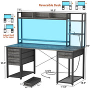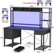 55.2'' Gaming Desk with LED Light & Outlets, Hutch and 3 Fabric Drawers, Reversible