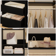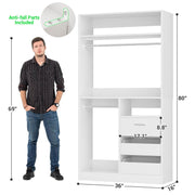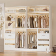 This combination wardrobe organiser with drawers can be used in a wardrobe or mounted in a corner, or you can purchase multiple pieces to install as a walk-in wardrobe, making the most of vertical space to create your personal wardrobe. The overall width of the wardrobe is 72 inches, including 6 drawers, 4 hanging rods, multiple dividers with adjustable mounting height, which can hold women's purses, organisers, accessory boxes, underwear, belts and other clothing accessories, as well as hanging multiple trench coats, coats, long skirts, trousers and so on. This wardrobe rack has a wall-mounted safety device that prevents it from tipping over due to excessive clothing!