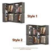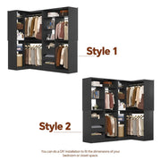 This combination wardrobe organiser with drawers can be used in a wardrobe or mounted in a corner, or you can purchase multiple pieces to install as a walk-in wardrobe, making the most of vertical space to create your personal wardrobe. The overall width of the wardrobe is 72 inches and includes 6 drawers, 4 hanging rods, multiple dividers with adjustable mounting heights, and this wardrobe shelf has a wall-mounted safety device that prevents it from tipping over due to excess clothing!