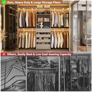 Heavy-Duty Closet Organizer System with Large Capacity Storage: Boost your walk-in closet organization with our 1000+ lb capacity wardrobe rack! Engineered wood shelves hold 300-400 outfits (dresses/jackets/suits) + storage bins for shoes underneath. Perfect closet storage solution for families - consolidate everyone's wardrobe vertically!