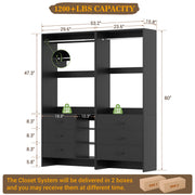 Compact and Efficient Design for Small Spaces: The freestanding closet organizer is compact and efficient, making it ideal for small spaces. It provides significant storage capacity without overwhelming your area, ensuring your space is used effectively. Even in a small bedroom or hallway, this system can fit perfectly and provide you with the storage you need. The dimensions of the system are 53.2'' W x 15.8'' D x 80'' H, providing ample storage space for all your belongings.