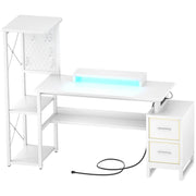 This computer desk is designed to maximize your workspace and keep you organized. The built-in charging station, complete with 3 AC outlets and 2 USB ports, makes sure your devices stay powered up while you work. Plus, an included LED light strip brightens up your work area, creating a comfortable and inviting atmosphere. A monitor stand also elevates your screen for better posture, and a removable hutch provides plenty of shelf space for decor and more. With a metal pegboard and 6 hooks, you can hang your tools, headphones, and decorations. An open storage shelf under the desktop can store your books and documents. Idea desk for small rooms. It can be used as a computer desk, home office desk, gaming desk, writing desk, study desk, or pc desk. Modern-style computer desk adds a comfortable atmosphere to your workspace and fits perfectly with any room space.