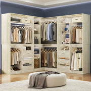 This combination closet has 6 hanging rods, 6 drawers, 11 shelves, which can hold clothing, changing baskets, luggage, shoes, bags and other living sundries, corner cabinet shelves can be installed according to the needs of a variety of heights to choose from; 4 half-open drawers and two closed drawers, to meet the need to place your underwear, socks, towels and other miscellaneous items, more than one rod at the same time can be hung with bustier dresses, suits, jackets, jackets, blazers, coats, etc.