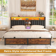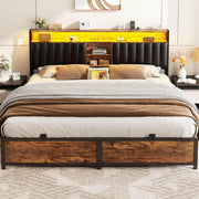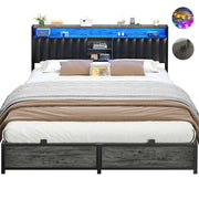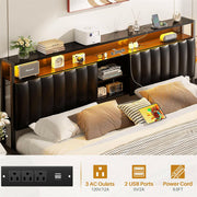 King Size Bed Frame with Power Outlets & LED Lights, With Open Bookcase Storage