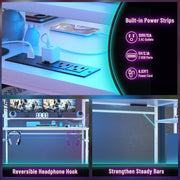 Upgrade your entertaining space with our L-Shape Gaming Desk with Power Outlet, a must-have for gamers seeking convenience and style. With built-in power outlets and USB connectors on the desktop, it streamlines your setup, making it perfect for charging multiple gaming systems. This standing desk is spacious enough to accommodate monitors, speakers, mic, mouse & keyboard, and more. The reversible design allows you to customize the side storage rack to fit your space, while the rhombus-shaped wooden frame adds a futuristic touch. Plus, with cool RGB LED lights and 20 dynamic modes, your gaming space will come alive with vibrant colors. Ergonomic features like the monitor stand and adjustable shelf height ensure comfort during long gaming sessions. Easy assembly is guaranteed with clear instructions and labeled parts.