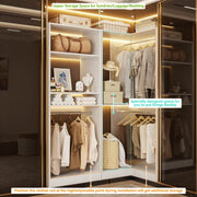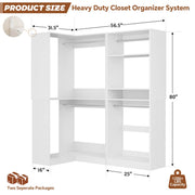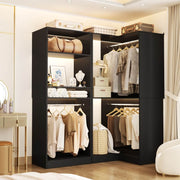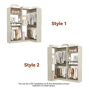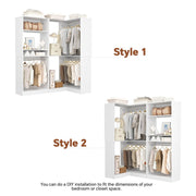 Freestanding Closet Organizer System with 2 Sets: This freestanding closet system kit consists of a freestanding closet and a corner closet featuring four hanging rods, 7 open storage shelves, and 2 adjustable shelves. Ideal for walk-in closets, bedrooms, and small spaces such as dorm rooms to enhance organization and storage.