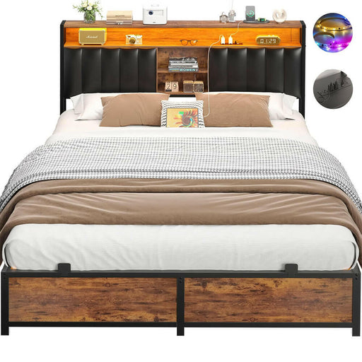 View full detailsQueen Size Bed Frame with Power Outlets & LED Lights, With Open Bookcase Storage