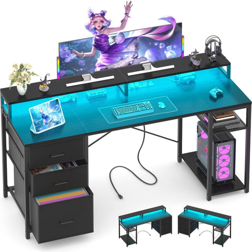 View full details59'' Gaming Desk with LED Strip, Power Outlets & File Drawers, Reversible